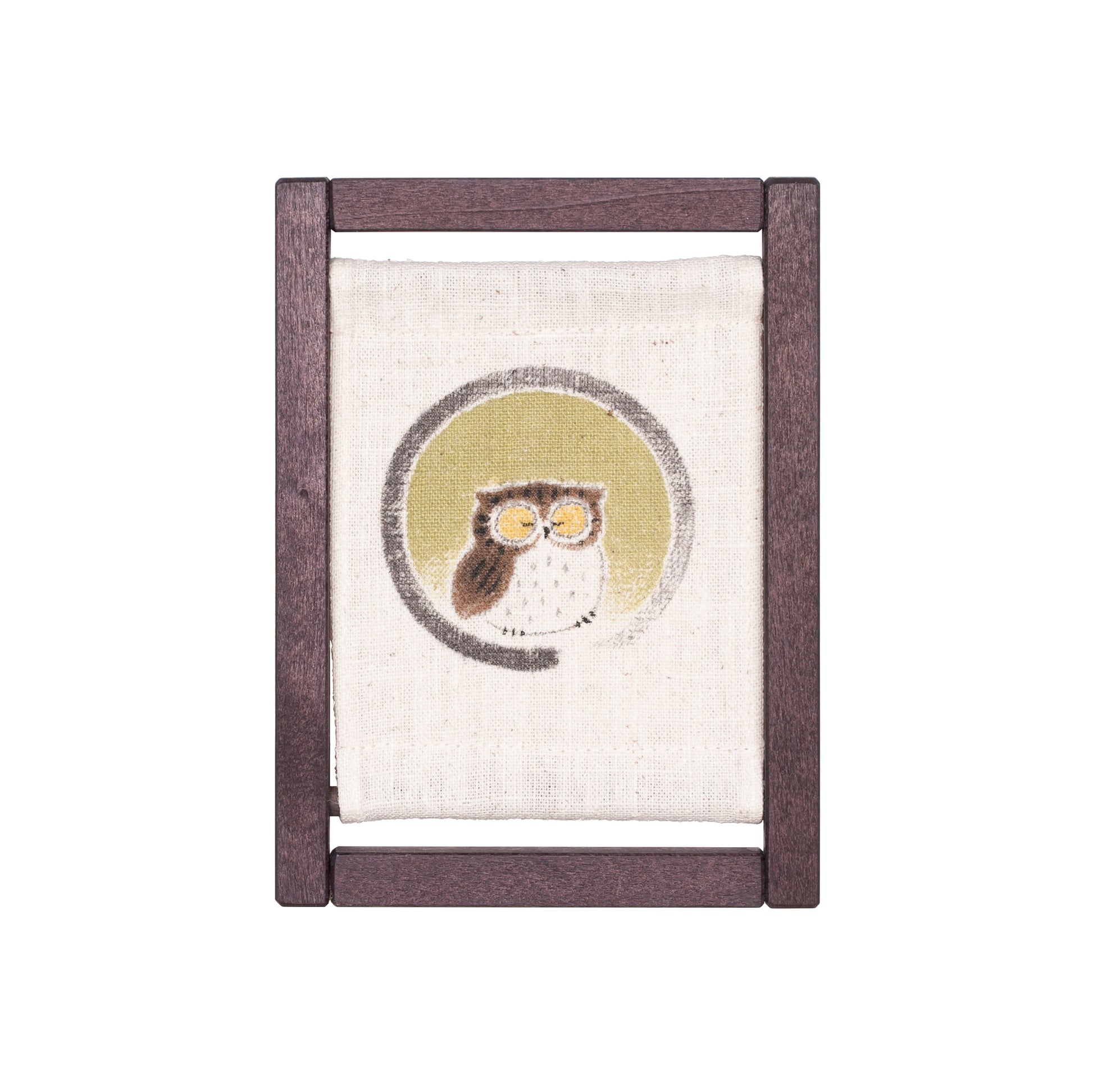 A mini wooden frame tapestry of an owl, a popular lucky charm in Japan. Owls are said to be auspicious, as they are associated with no hardships and mean "no suffering." This 2-way design can be hung on the wall or placed on a table. The legs are removable. Perfect for easily displaying the season.