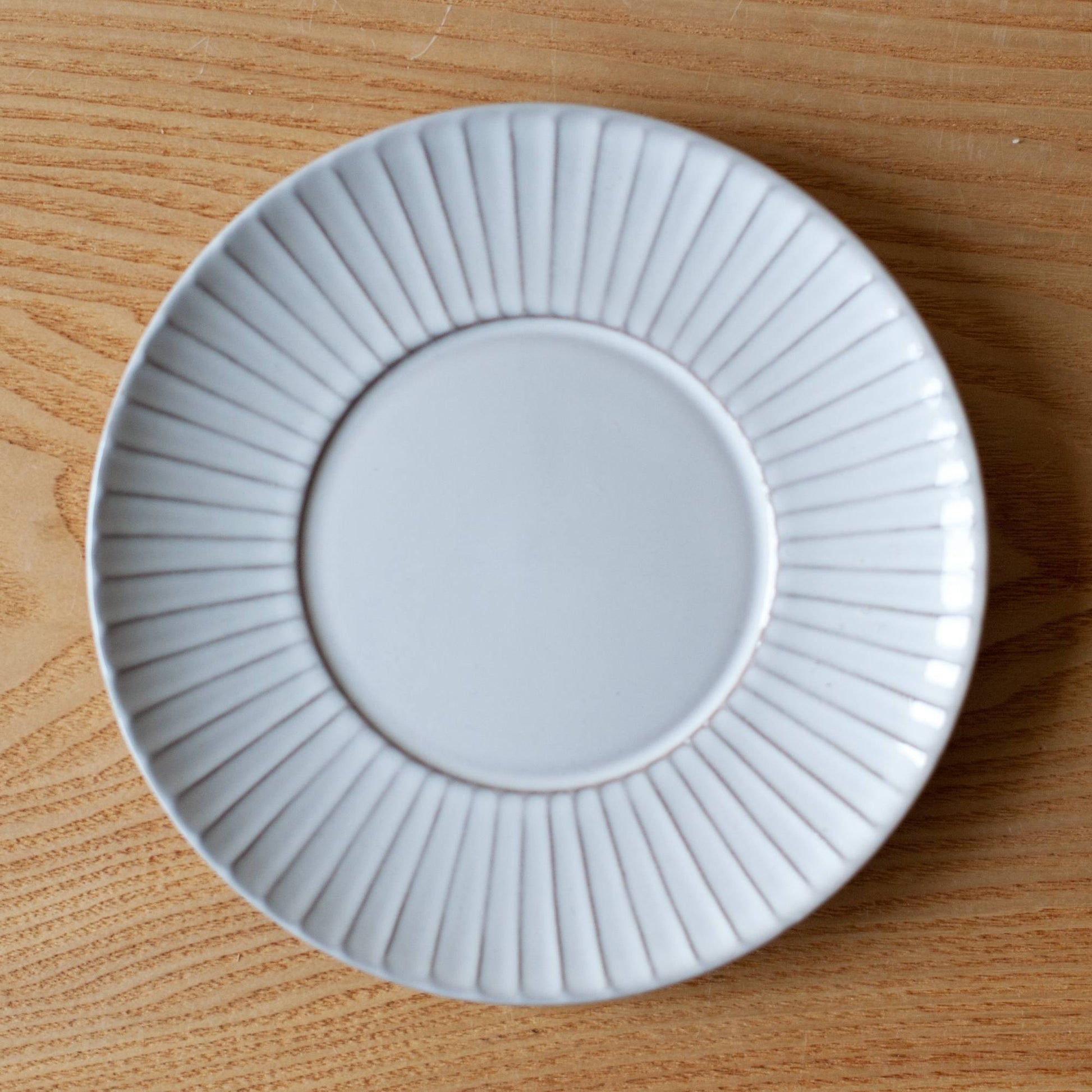 The thin and delicate shape of the Plato combines a simple style with a classic embossed pattern. A thin layer of glaze is applied to make the lines stand out. Gray khaki is made from earthenware and is characterized by uneven coloring. This is a popular series that goes well with ingredients such as cakes, tarts, quiches, and bread.