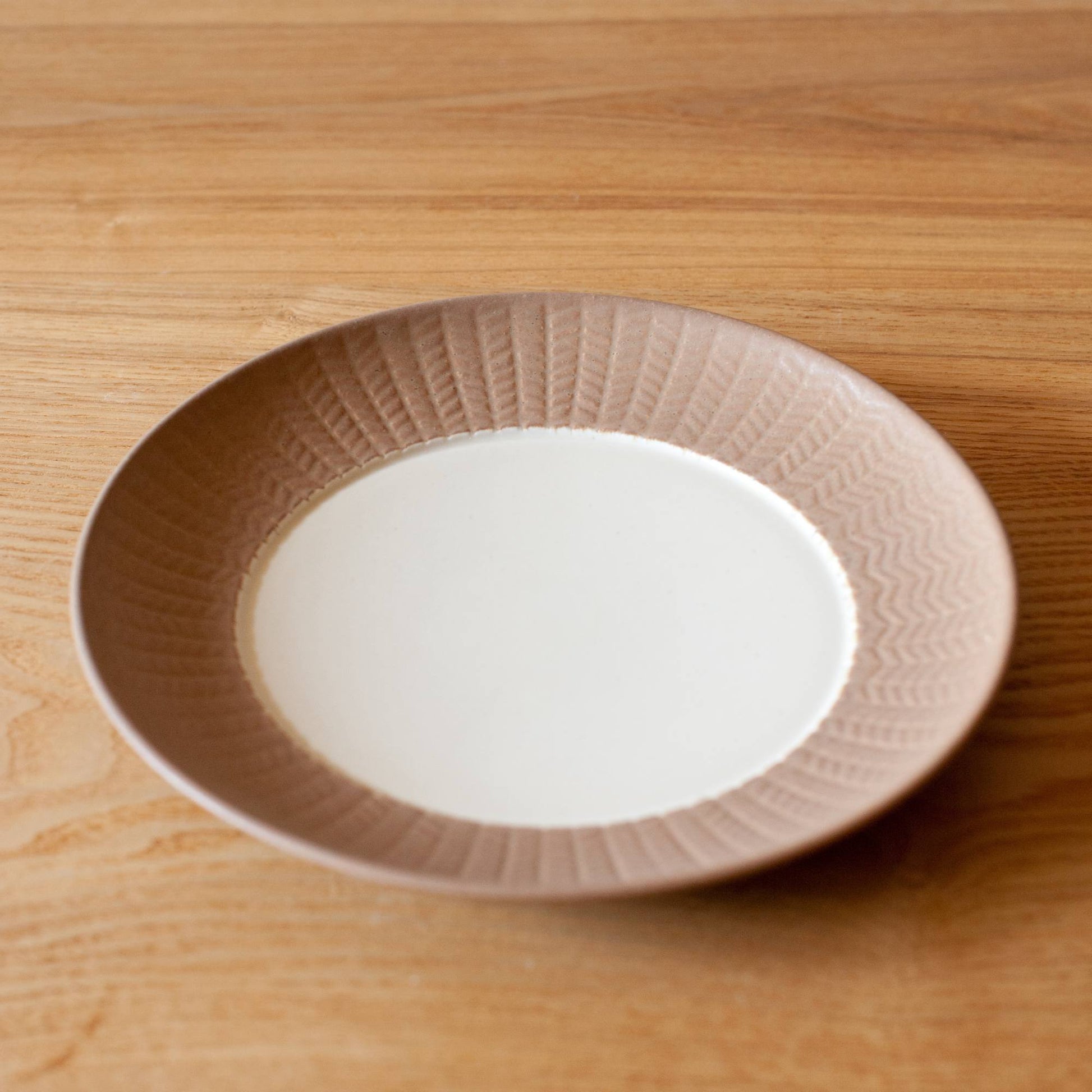 This is a series of cafe items that feature an embossed herringbone pattern finished with a thick, fluffy glaze for a warm texture. The surface is decorated with a twill weave pattern and is coated with a glaze newly formulated for this series. It has a texture that feels soft and warm, just like knit. Try combining it with autumn and winter table items such as woolen interior accessories and knitted placemats.