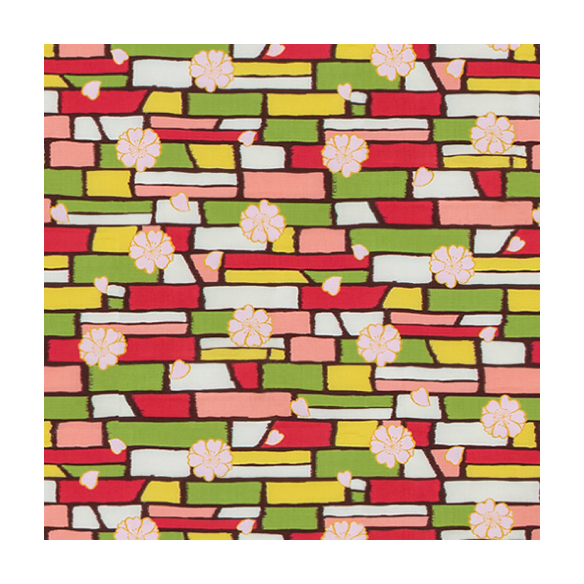A furoshiki featuring "Meisen", a popular Taisho retro pattern. In the Taisho era, walking around town in a kimono with a pop pattern was a new style at the time. Silk woven kimonos called Meisen, which incorporate overseas textile designs, were particularly popular among young girls who jumped on the trend, or modern girls. This series reproduces the colorful world of Meisen and the delicate expression of the ikat weave in print and arranges them into furoshiki. [Sakura] This depicts cherry blossoms dancing on colorful bricks. Cherry blossoms are said to represent the fulfillment of wishes and good relationships, and are said to connect people not only in love and marriage, but also with other people.