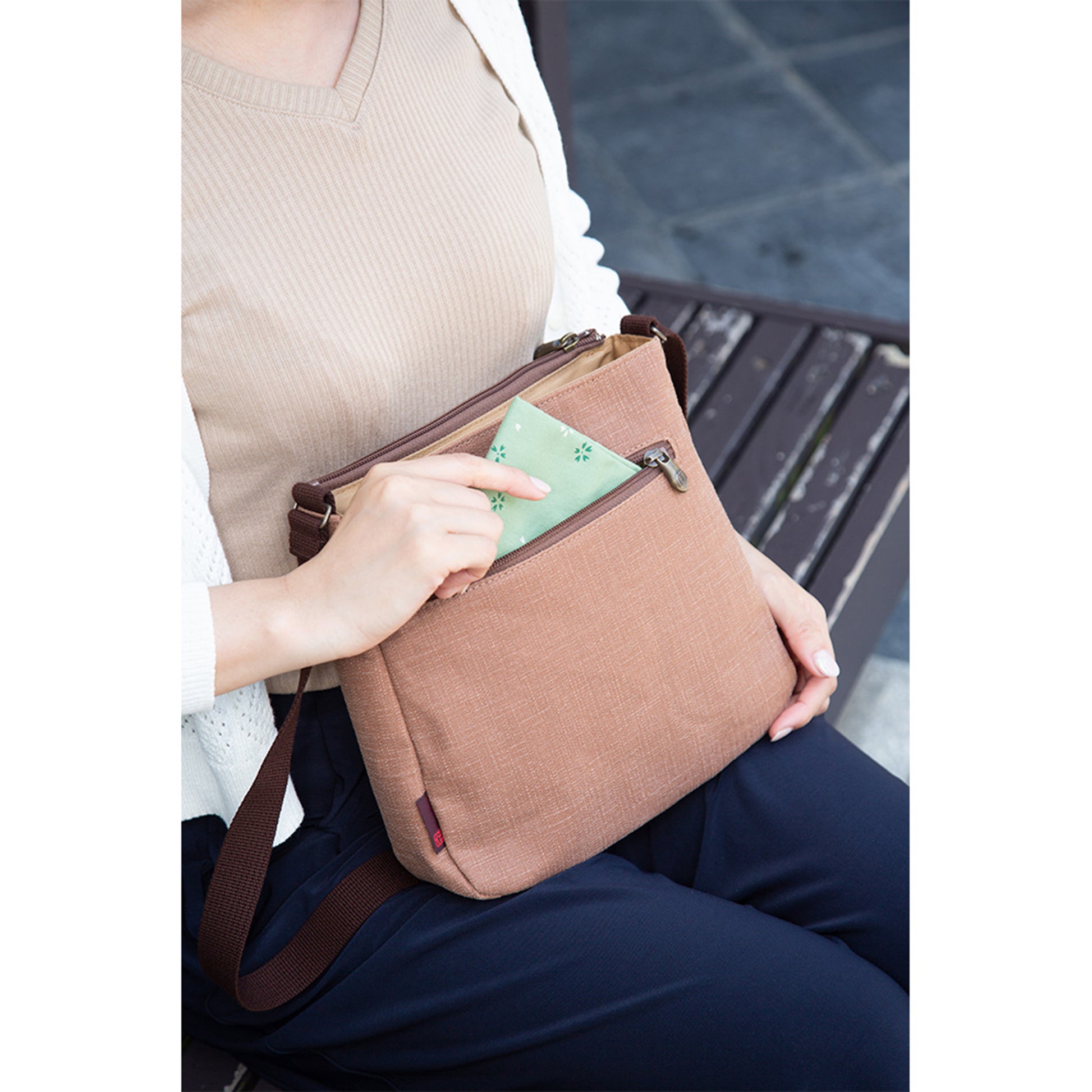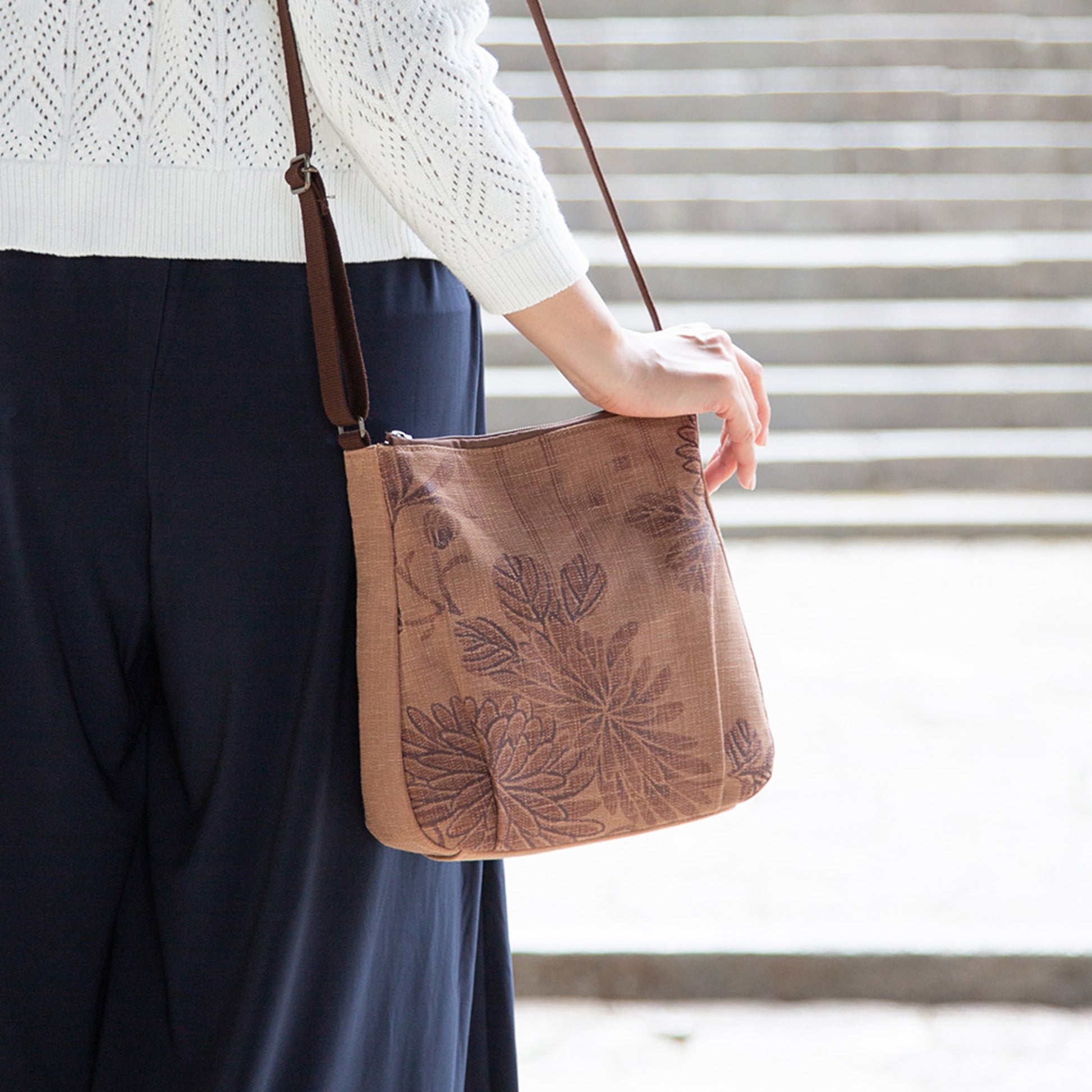 The more you use persimmon tannin dyeing, the more texture and character it develops. The expression it shows varies depending on the user, so you can enjoy it as a unique item that is one of a kind. The charm of persimmon tannin dyeing, which is a natural dye, is that the texture changes every year. Even if you just leave it unused, after a few years the color will "gradually" change to a deeper color...It has a warmth that cannot be found with chemical dyes. This pouch bag is compact and easy to use, so it is often used. It can hold A5 magazines and 500ml plastic bottles. The light fabric and thick shoulder strap make it easy to carry even if you have a lot of luggage. [Specifications] Body: Main magnetic hook opening and closing Front: 1 zipper pocket Back: 1 zipper pocket Inside: 2 open pockets