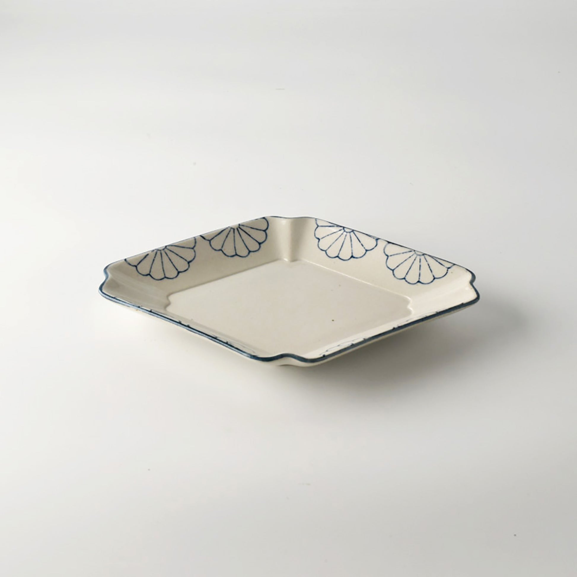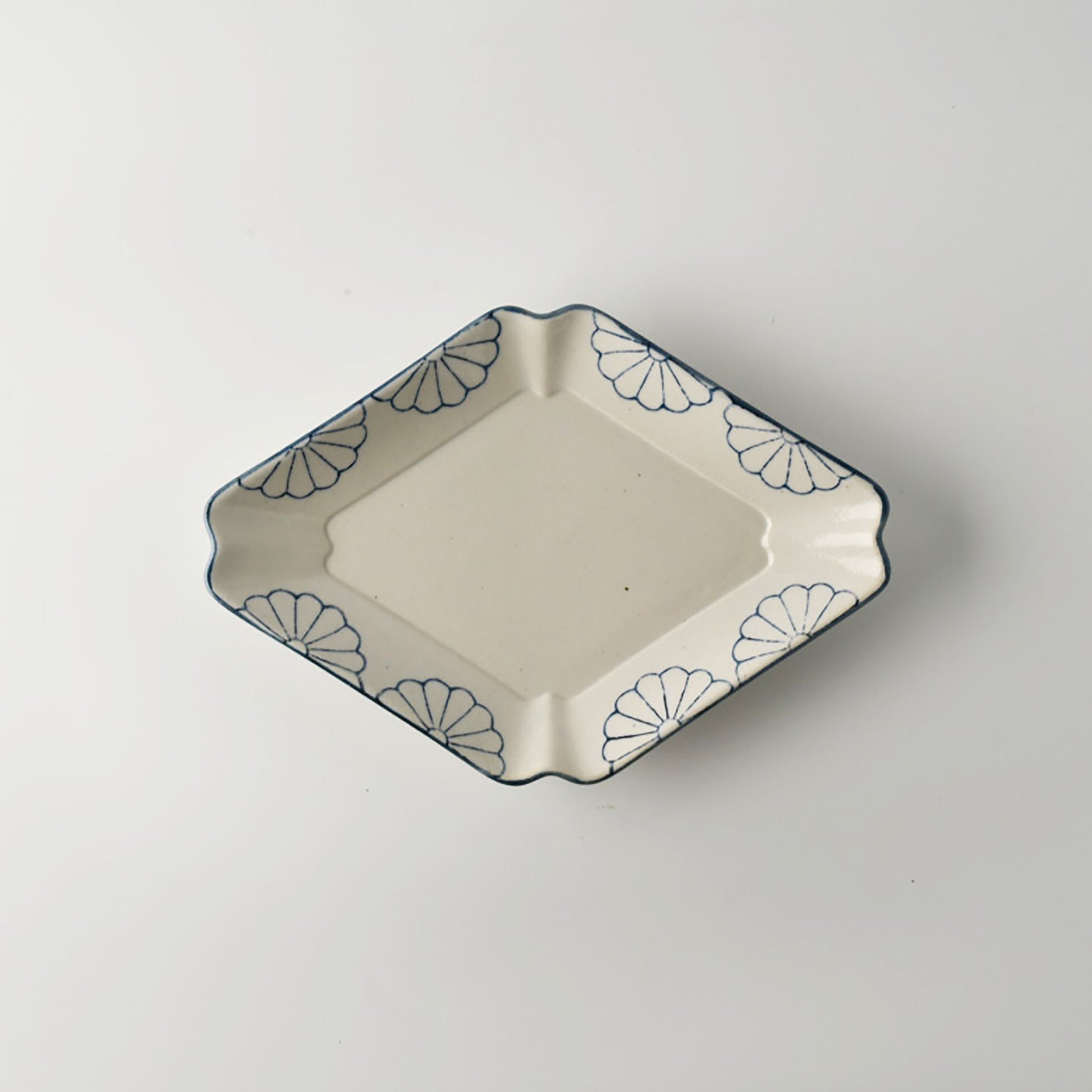 The painting, which makes use of the shades of gosu, is a work of art. The bold, old-fashioned chrysanthemum pattern, hand-painted and stamped, is a gorgeous piece. The diamond shape is also a nice accent on the dinner table. The diamond-shaped dish is perfect for filleted fish, sashimi, and side dishes. The bean dish can be used to add soy sauce or salt.