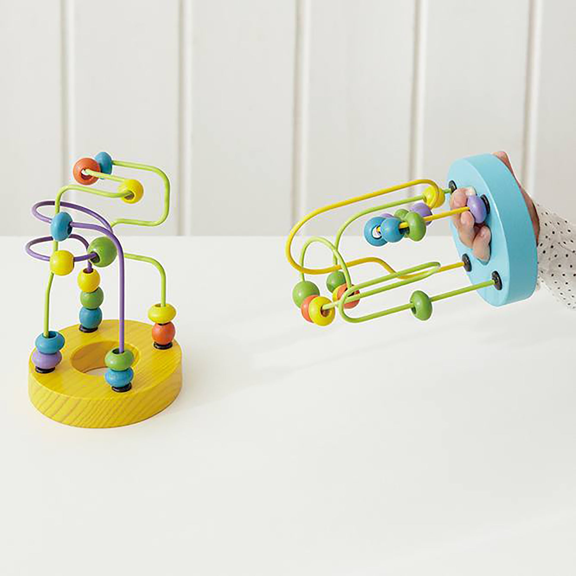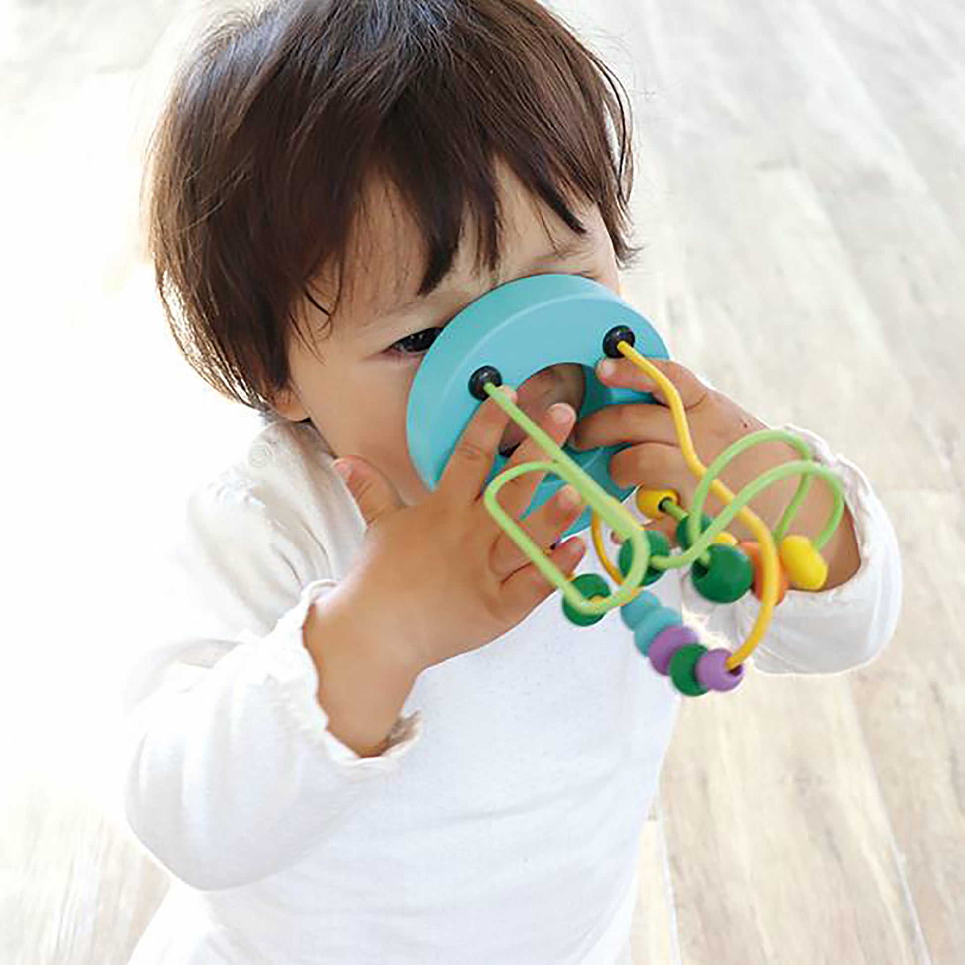 Two bead coasters in gentle colors. The wire has been changed to a different shape, so you can enjoy the different movements of the beads. There is also a hole in the base, so you can put your hand in and shake it to play with it as a rattle, or look through the hole to see the beads moving. Fingertip play, moving the beads around, develops dexterity and concentration.