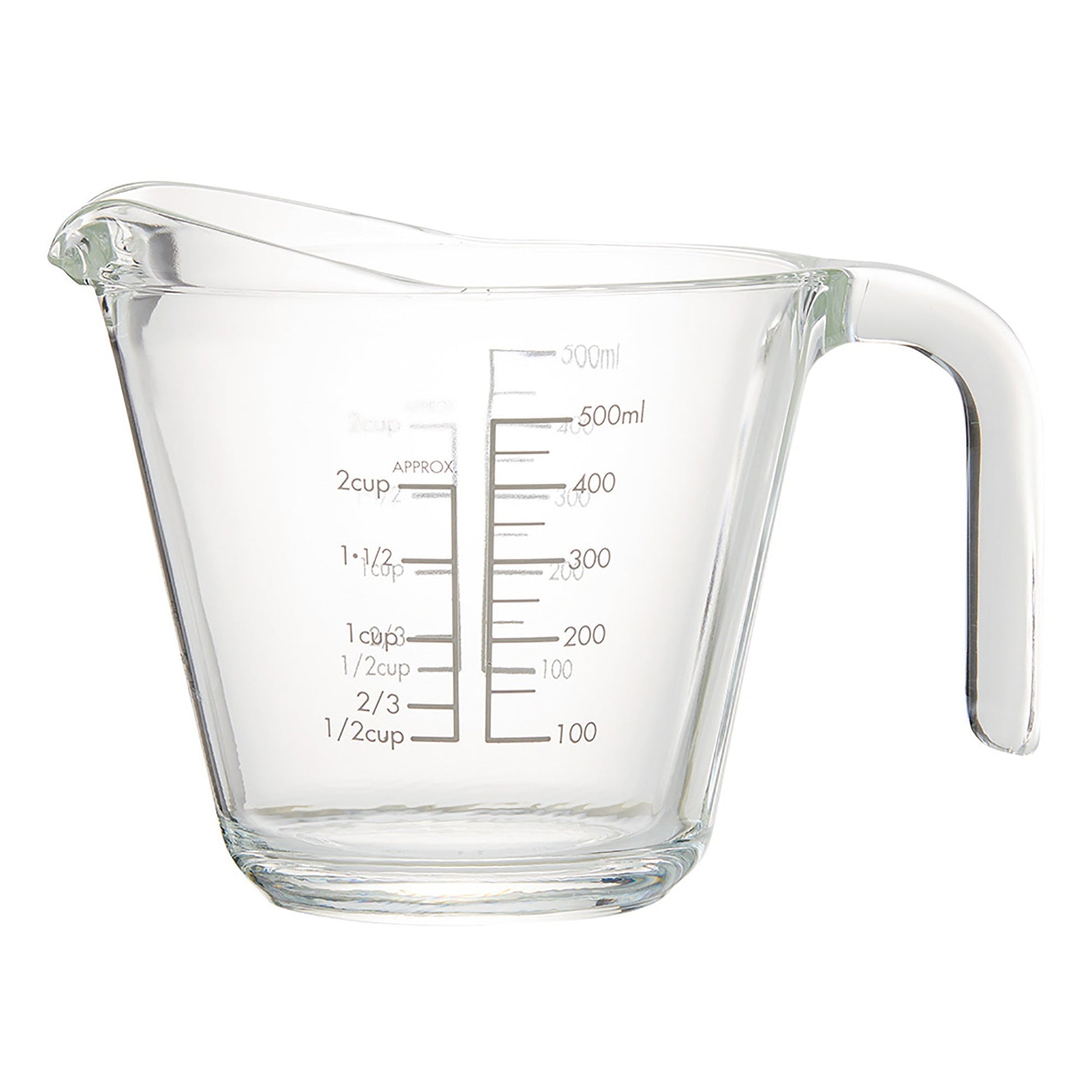 Heat-resistant glass measuring cup that is microwave, oven and dishwasher safe