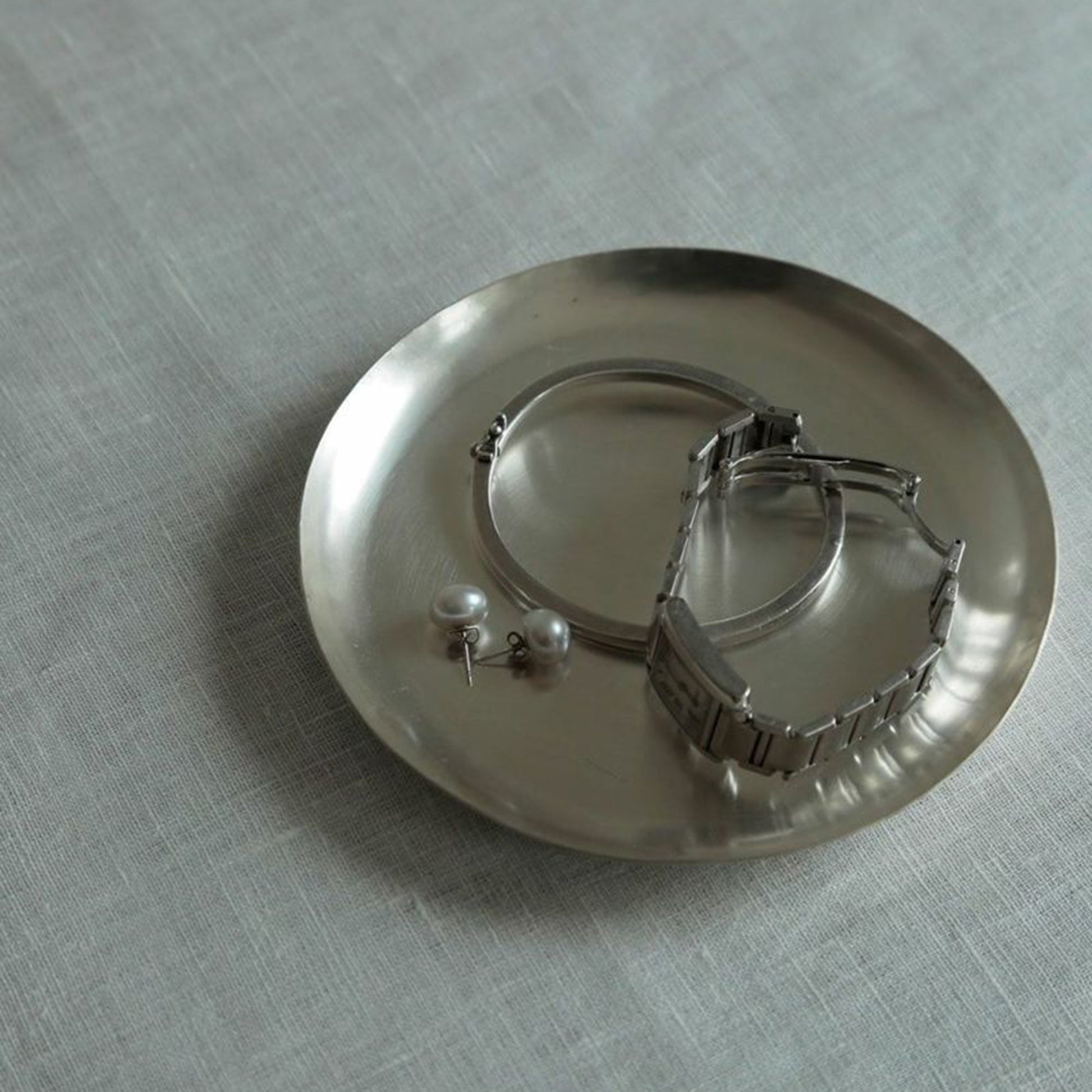 真鍮の表面にシルバーメッキ加工を施した、ふちの立ち上がりがきれいな丸形のトレイ。 落ち着いたツヤ感で、時間が経つとより風合いが増し、アンティークのような雰囲気に。 コースターとしてつかったりキャンドル置きにしても◎お菓子をのせたり、 アクセサリーや時計の定位置にしたり、デスクの上の細々したものの整理整頓にもおすすめです。