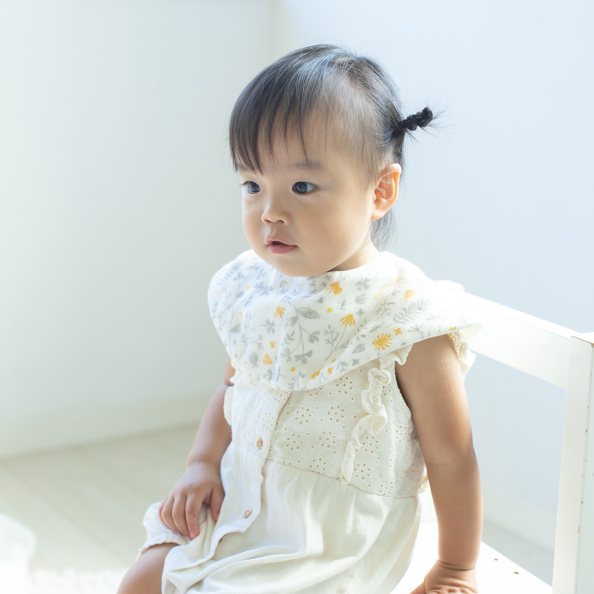 生成りの生地にやさしいボタニカル柄をのせた、オーガニックコットンガーゼのサークルスタイ。 ふっくらとした厚みと柔らかさの6重ガーゼ仕様です。 洗うほどにガーゼが柔らかくなり、層と層の間に空気を含むようになるので よりふっくら感が増して使いやすくなるアイテムです。 ※2段階調節できるスナップ付き。赤ちゃんの成長に合わせて調節できます。 Made in Japan