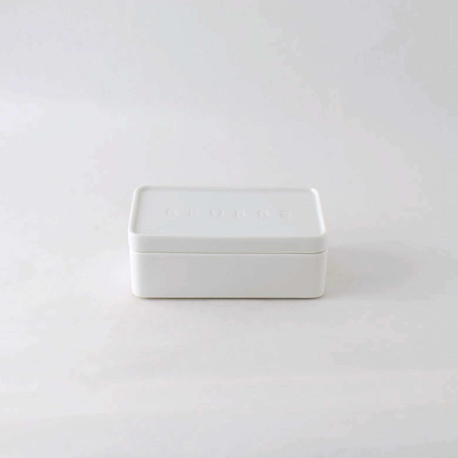 清潔感ある白磁の白にロゴがアクセント。200gのバターがぴったり収まります。スタッキングでき、お料理や用途にあわせて、有塩・無塩と使い分けするのにもおすすめ。