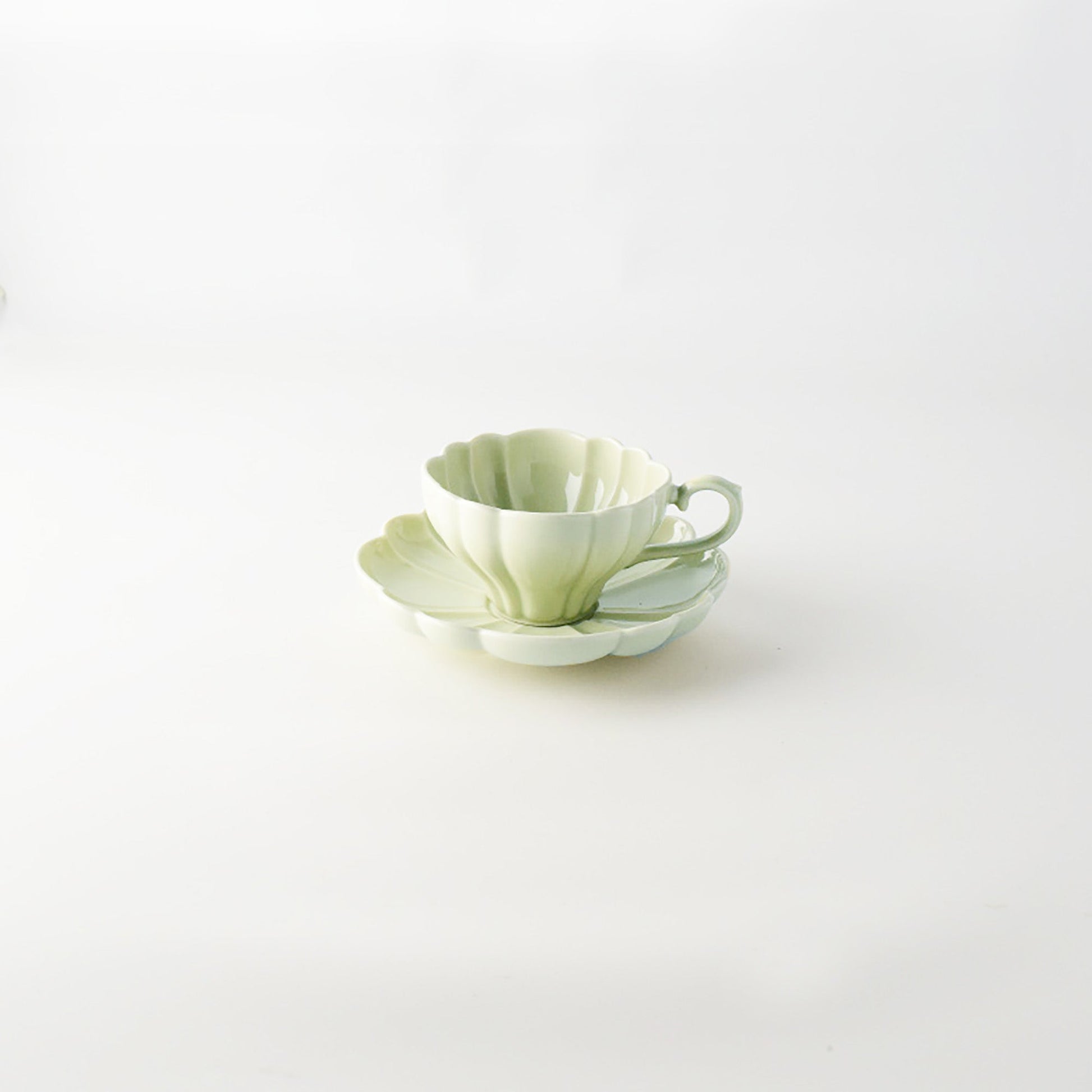 ヨーロッパのアンティーク食器のような装飾が優雅な、花のようなカップとソーサーのセット。ルブケは「花束」という意味です。お茶を注いで上から見ると、フチの形と中心に向かうラインによって、お茶が花の形に見えます。