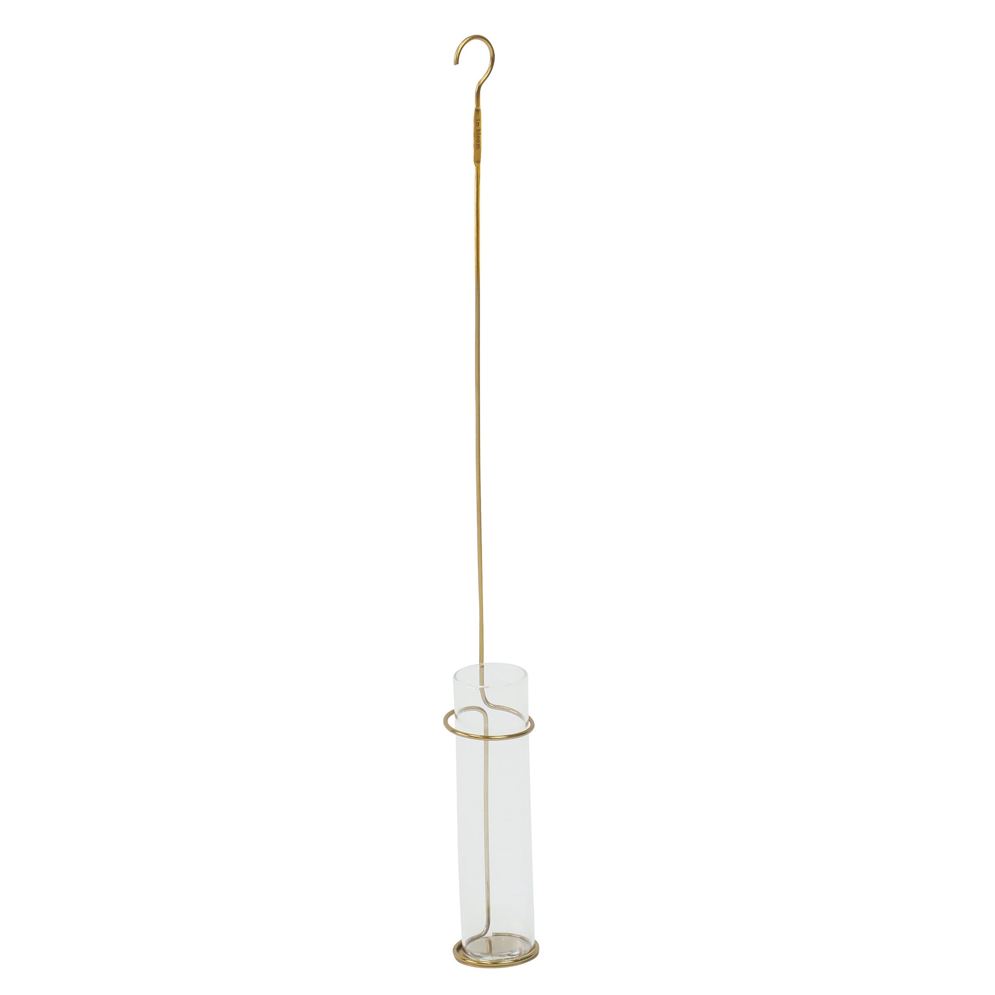 生花も飾れるゴールド仕上げのハンギングフラワーべース。 一筆書きのようなアイアンのフレームをゴールドに塗装しました。 長さ約38cmのLサイズは、茎や枝を長めに残したい時に バランスよく飾りやすいサイズ感です。 フレームの中にはガラスが入っているので、 ドライフラワーだけでなく生花も飾ることができます。 柄の部分ににある「inbloom」の刻印がワンポイント。 フックなどに引っかけるだけで、草花を楽しみながら 壁面や空間を彩ることができるアイテムです。